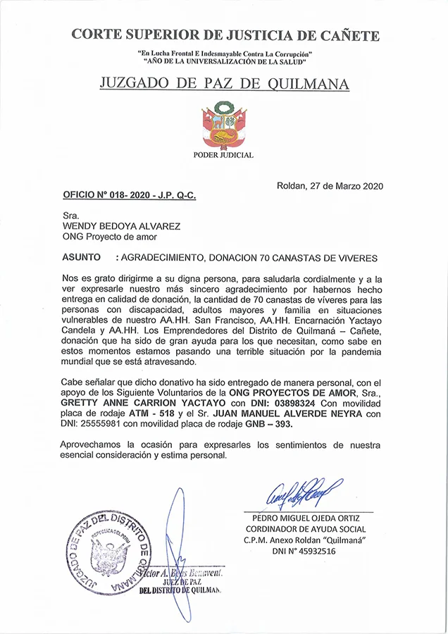 Agradecimiento Juzgado de Paz Quilmaca – Corte Superior de Justicia de Cañete