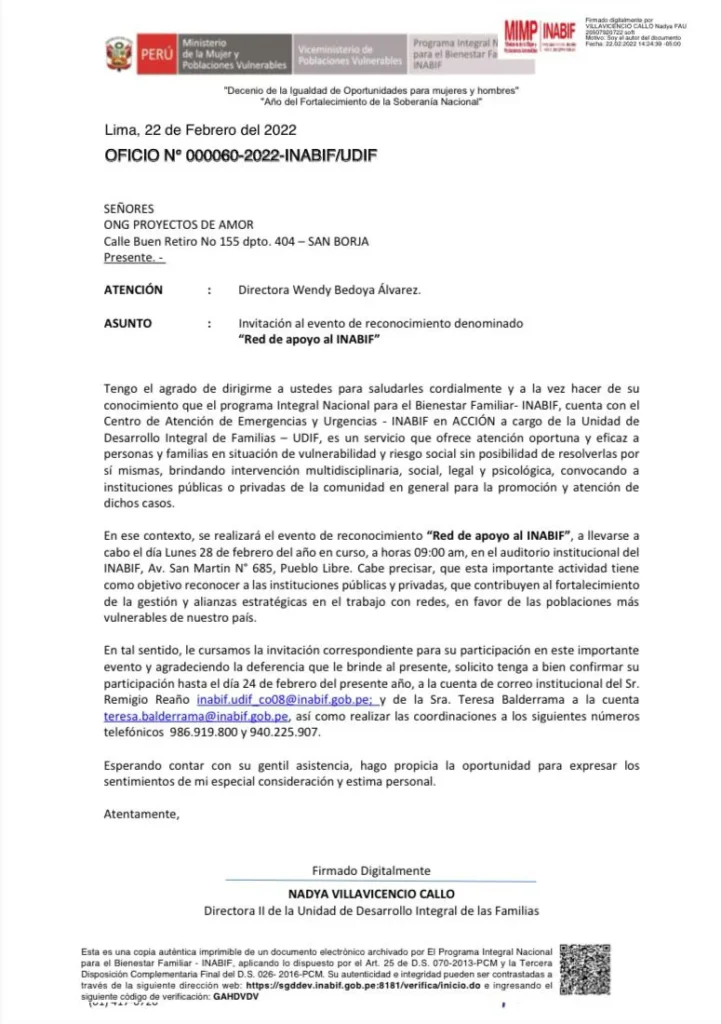 Reconocimiento del INABIF y del Ministerio de la Mujer y poblaciones vulnerables